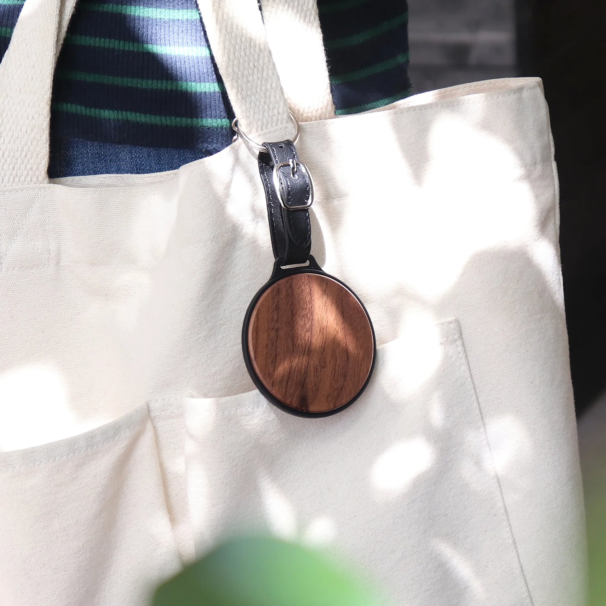 The zinc alloy frame highlights the rich wood grain, creating a balanced contrast between organic texture and sleek metal shine. With its smooth, rounded form and warm wooden finish, it’s both a practical identifier and a tasteful style accent that elevates any bag.