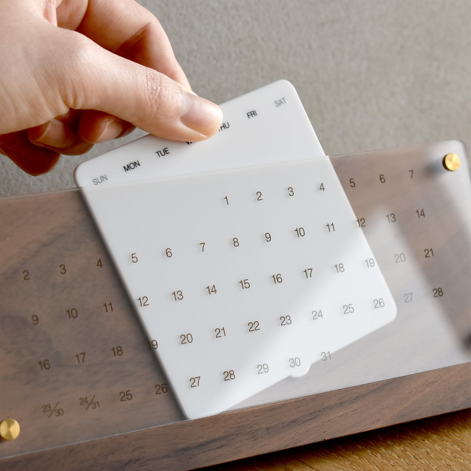 The dates on the transparent acrylic are clearly visible only where the whiteboard is positioned. A protrusion at the bottom of the whiteboard fits into a recess in the wooden base. When sliding the board, it clicks securely into place, providing a satisfying, firm hold.