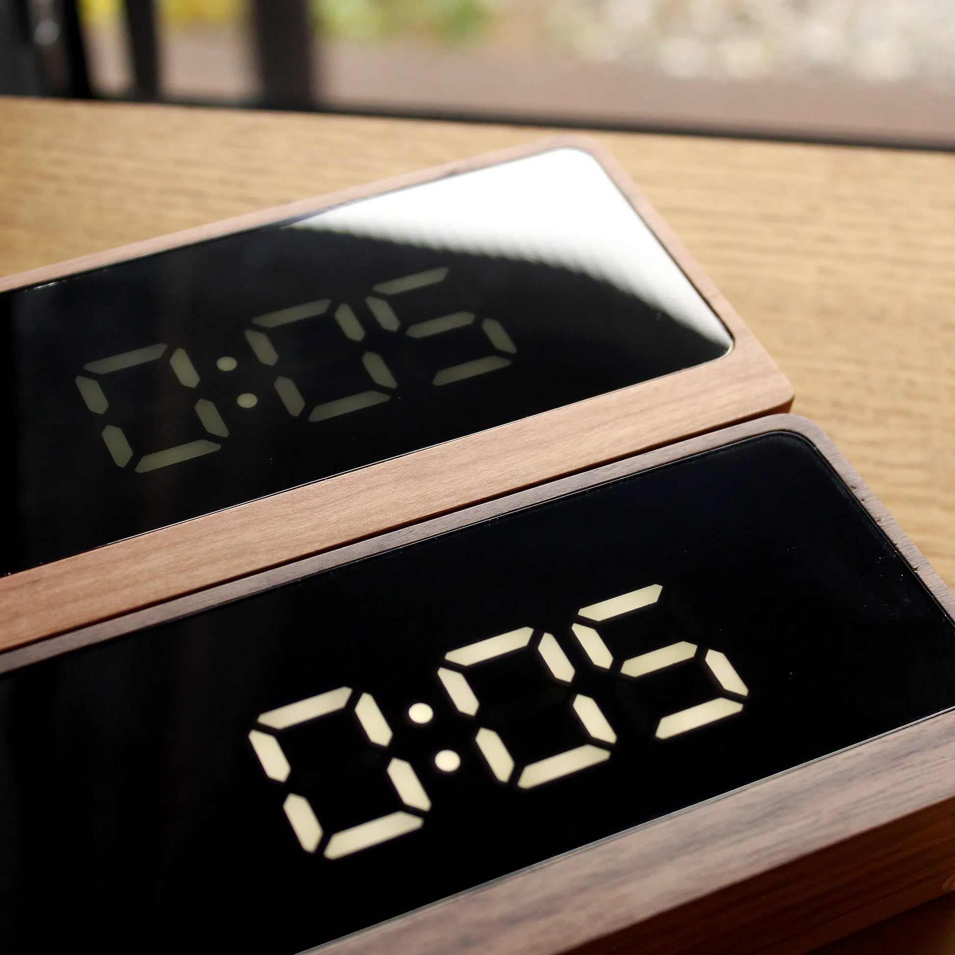 A captivating table clock that blends functionality with a touch of magic. Its digital time display appears to float across the mirrored surface, creating a clean and contemporary aesthetic. The white LED is easy to read even in the dark, with two brightness levels that ensure a soft, non-intrusive glow at night.