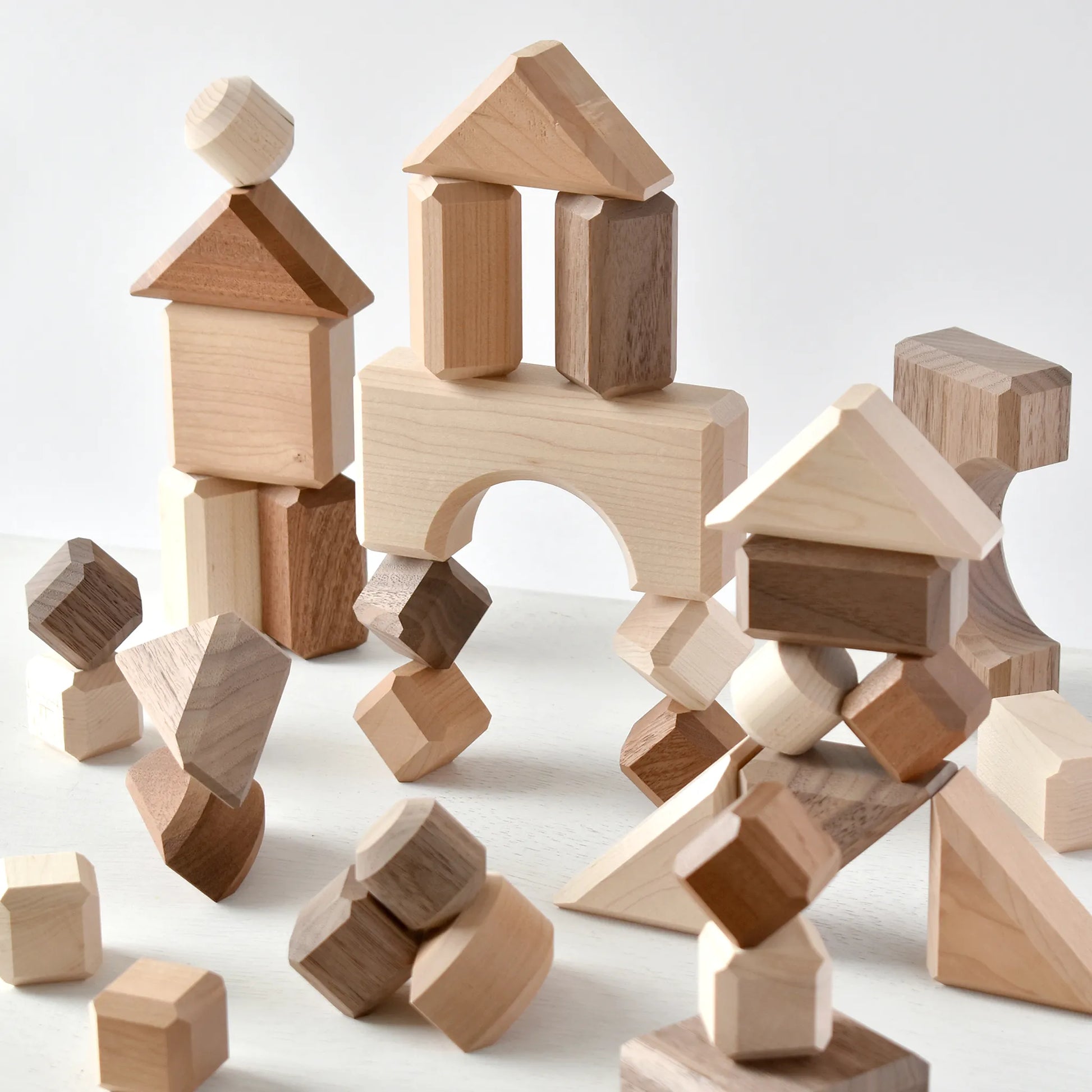 Each piece is finished with a safe, uncoated surface, allowing children to enjoy the natural color, weight, and texture unique to each wood type.